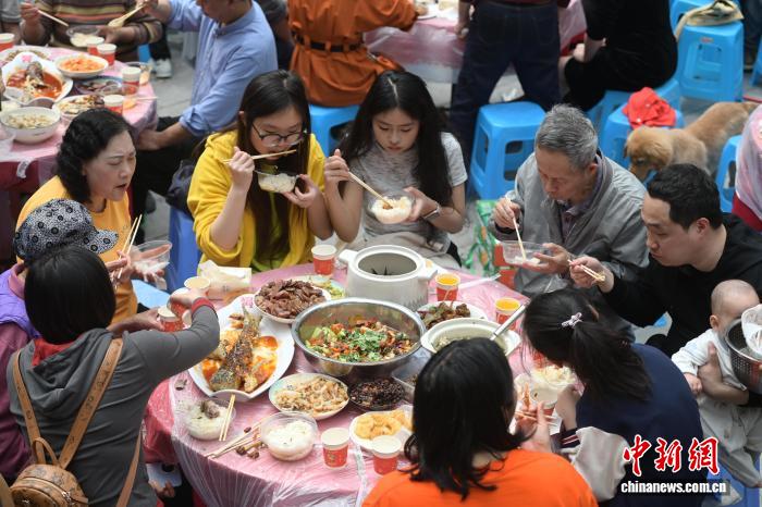图为百家宴现场1个“4世共堂”家庭品味好食。旧鑫 摄