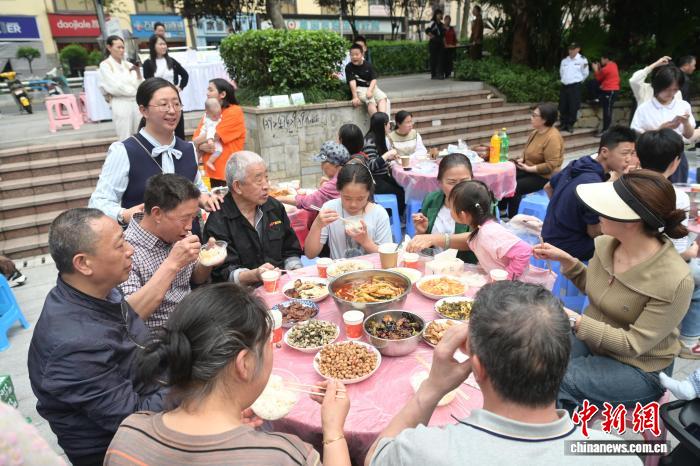 图为百家宴现场,住户围坐品味好食。旧鑫 摄